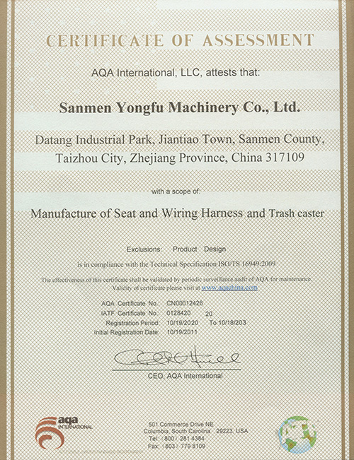 SanMen County's YongFu Machinery Co,.Ltd.which established in 2008,is a diverse private-run company which specializes in manufacturing Car seat, Car cable bunch, electrical Vehicle, Motorcycle Frama, Car Braking components, etc. It located in JIANTIAO industrial zone, east coast Zhejiang province, where adjoin the YongTaiWen High Speed Rail Way and The YongTaiWen Motor Way,near to the Major Eastern International port, the Ningbo Sea port, bordering South to the door of Zhejiang, the Taizhou Air port which is the most convenient pathway of east Zhejiang province.